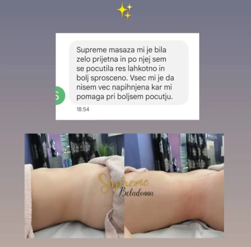 Supreme tehnike so edinstvene, saj so skupek znanja dolgoletnih izkušenj, ki sem jih pridobila z delom v Beladonni. V teh letih se ugotovila, da daje kombinacija več različnih tehnik pri marsikateri stranki boljše in dolgotrajnejše rezultate pri odpravljanju globokih limfnih zastojev. Zbrala sem svoje znanje in ga združila v nov Supreme Beladonna tretma.